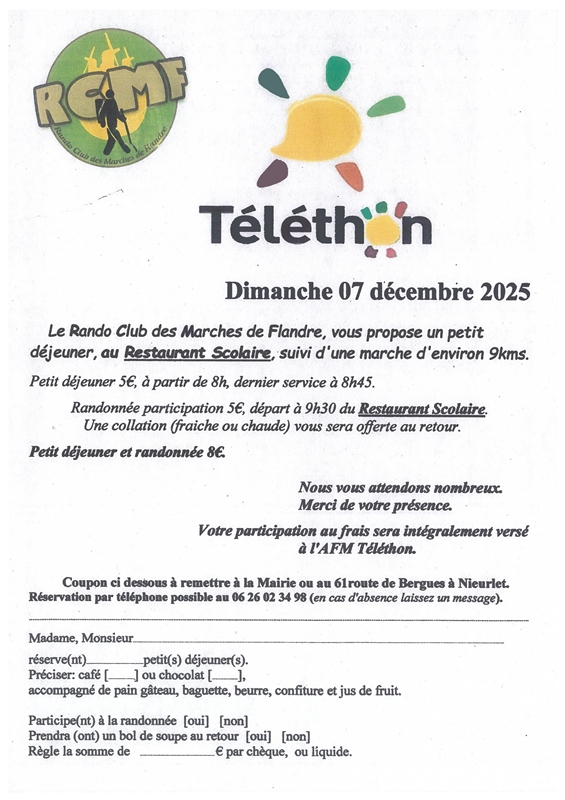 Téléthon : dimanche 7 décembre à partir de 8h - restaurant scolaire - petit déjeuner suivi d'une marche de 9 km (RCMF)